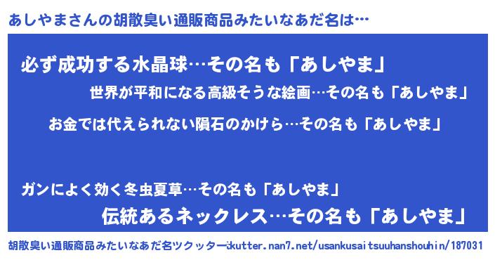 | 男性向けラノベタイトル風あだ名 | 『ノーゲーム・ノーアシヤマ』 |