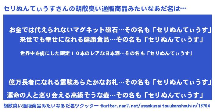 | 意味不明あだ名 | 『住所不定無職セリぬんてぃうす(68歳)』 |