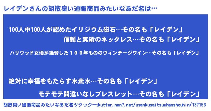 | 男性向けラノベタイトル風あだ名 | 『緋弾のレイデン』『レイデンスレイヤー』 |