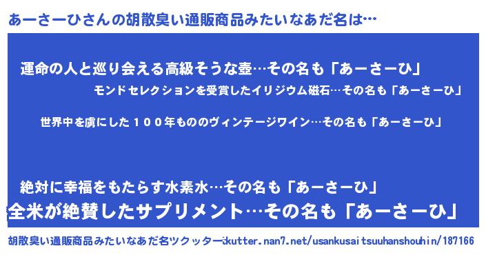 | 欧米人風あだ名 | 『アンジェラ・あーさーひ』 |
