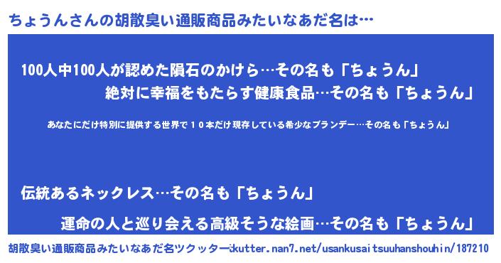 | 男性向けラノベタイトル風あだ名 | 『この素晴らしい世界にちょうんを!』 |