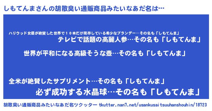 | 男性向けラノベタイトル風あだ名 | 『やはりしもてんまの青春ラブコメはまちがっている 』 |