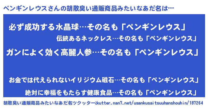 | ヘコむあだ名 | 『ペンにー』『ペンギンレウス(笑)』 |