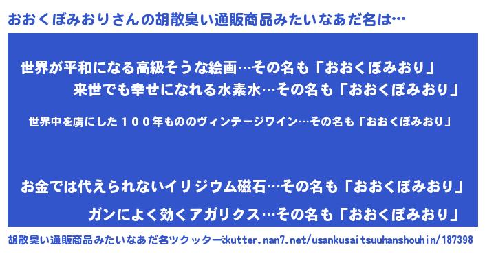 | 男性向けラノベタイトル風あだ名 | 『この素晴らしい世界におおくぼみおりを!』 |