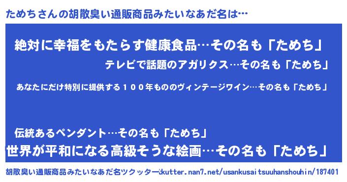 | 男性向けラノベタイトル風あだ名 | 『この素晴らしい世界にためちを!』 |