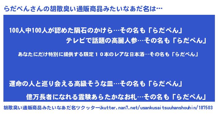 | 男性向けラノベタイトル風あだ名 | 『この素晴らしい世界にらだぺんを!』 |