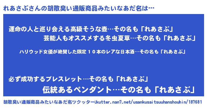 | 意味不明あだ名 | 『住所不定無職れあさぶ(43歳)』 |