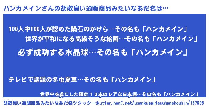 | 男性向けラノベタイトル風あだ名 | 『ハンカメインの憂鬱』 |