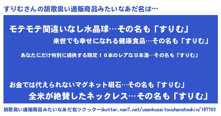 | 意味不明あだ名 | 『住所不定無職すりむ(53歳)』 |