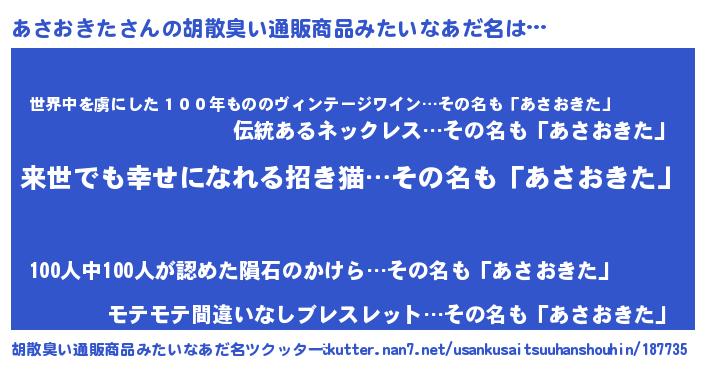 | 意味不明あだ名 | 『永久保存あさおきた』 |
