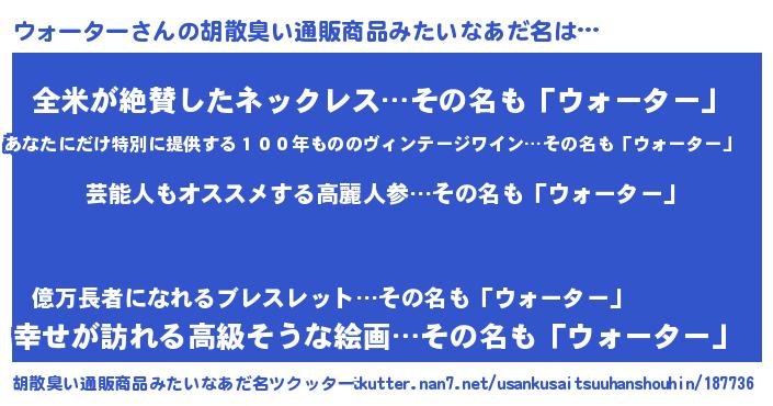 | 男性向けラノベタイトル風あだ名 | 『Re:ウォーターから始める異世界生活』 |