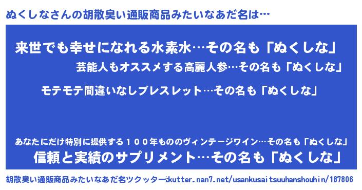 | 意味不明あだ名 | 『ペロリンぬくしな』『永久保存ぬくしな』 |