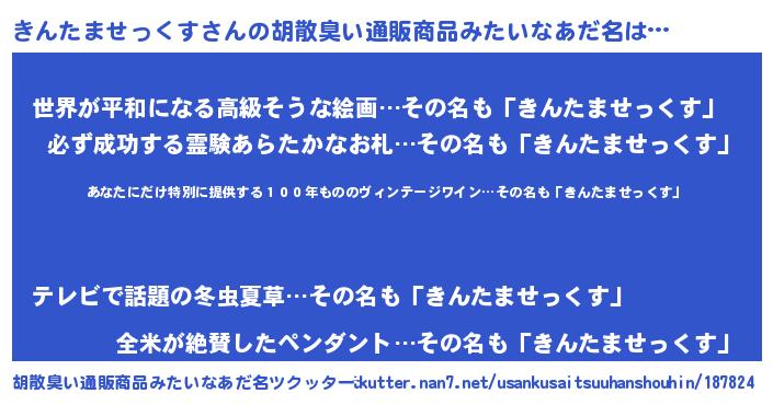 | 意味不明あだ名 | 『住所不定無職きんたませっくす(1歳)』 |