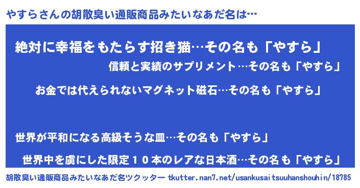 | ヘコむあだ名 | 『やすら(小並感)』『やすお』 |