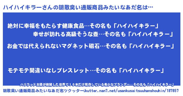 | 男性向けラノベタイトル風あだ名 | 『ノーゲーム・ノーハイハイキラー』 |