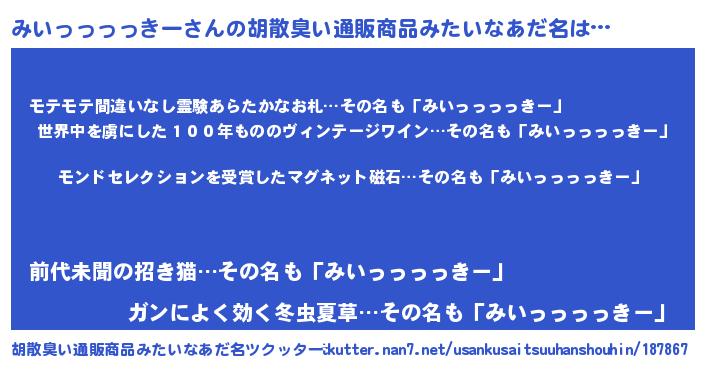 | ヒーロー風カッコイイあだ名 | 『慈愛の使者みいっっっっきー』 |