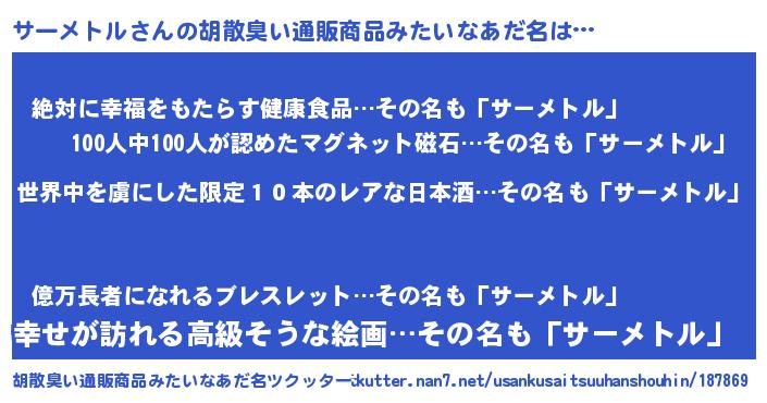 | 意味不明あだ名 | 『住所不定無職サーメトル(62歳)』 |