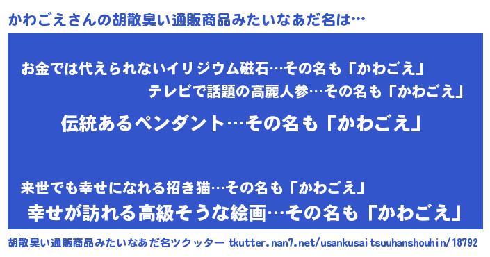| 男性向けラノベタイトル風あだ名 | 『かわごえに滅ぼされるだけの簡単なお仕事です』 |