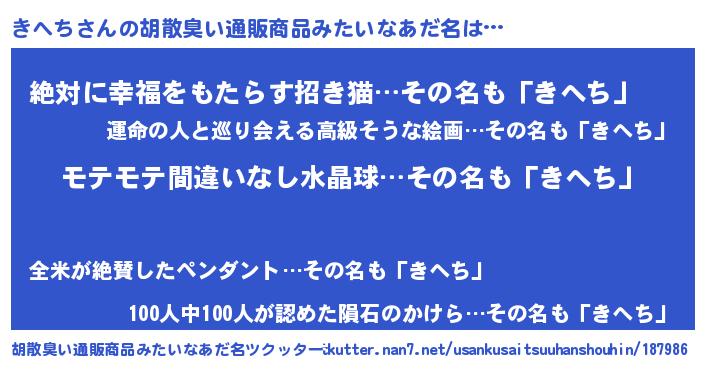 | 男性向けラノベタイトル風あだ名 | 『きへちの憂鬱』『キヘチスレイヤー』 |