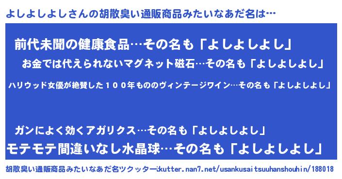 | 意味不明あだ名 | 『住所不定無職よしよしよし(6歳)』 |