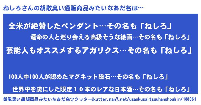 | 欧米人風あだ名 | 『アンジェラ・ねしろ』『ウサインねしろ』 |