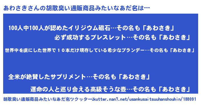 | 意味不明あだ名 | 『住所不定無職あわさき(84歳)』 |