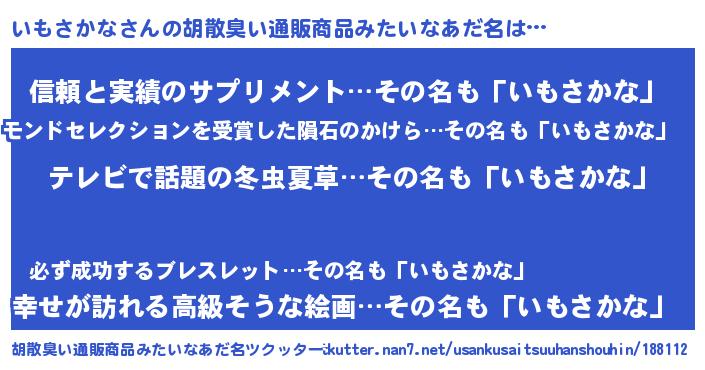 | 男性向けラノベタイトル風あだ名 | 『Re:いもさかなから始める異世界生活』 |