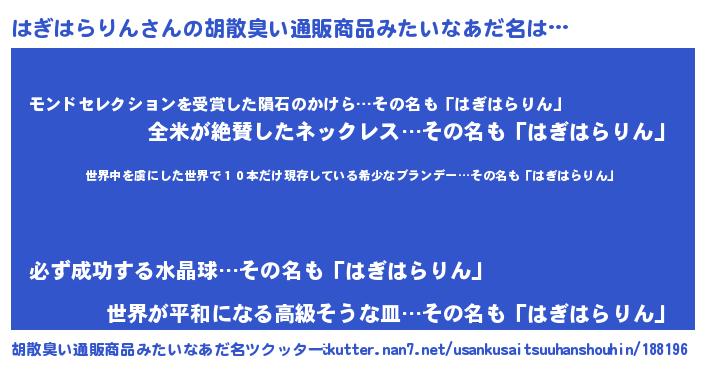 | 意味不明あだ名 | 『住所不定無職はぎはらりん(71歳)』 |