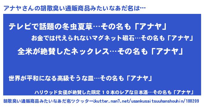 | 男性向けラノベタイトル風あだ名 | 『アナヤの嫁は女の子じゃないと思った?』 |