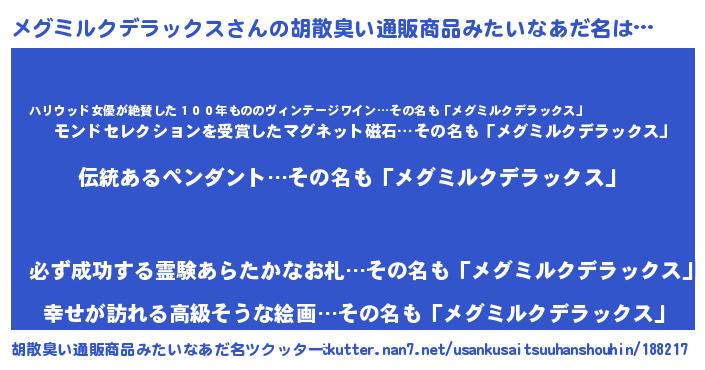 | 女子向けラノベタイトル風あだ名 | 『メグミルクデラックスの卵を拾いまして』 |