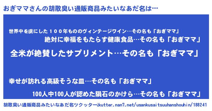 | 男性向けラノベタイトル風あだ名 | 『おぎママに滅ぼされるだけの簡単なお仕事です』 |