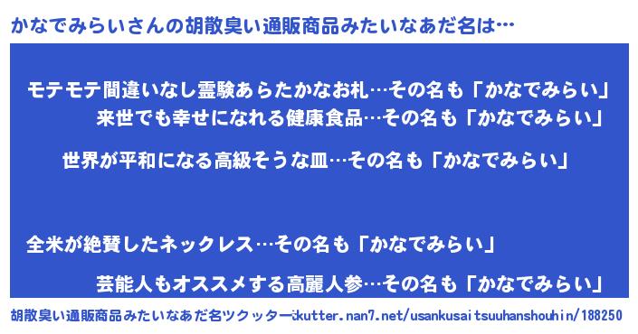 | 恥ずかしいあだ名 | 『かなっちょ』『プリティーかなでみらい』 |