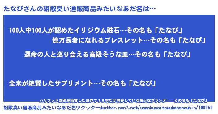| 男性向けラノベタイトル風あだ名 | 『たなぴ~年齢イコール彼女いない歴の魔法使い~』 |