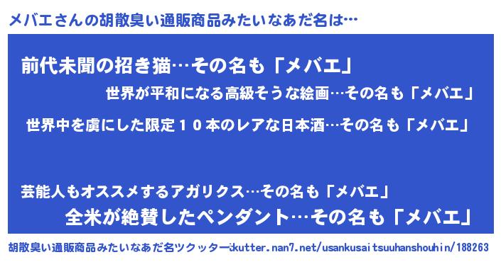 | 意味不明あだ名 | 『住所不定無職メバエ(14歳)』 |