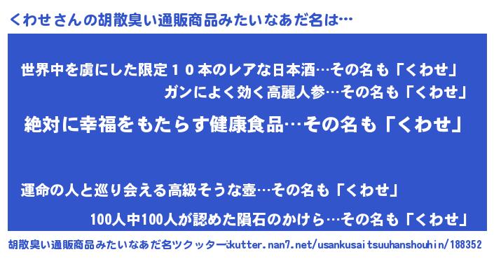 | 男性向けラノベタイトル風あだ名 | 『くわせという概念が存在しない退屈な世界 』 |