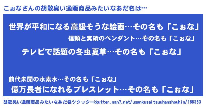 | ヒーロー風カッコイイあだ名 | 『最強戦士コォナ』『ウルトラこぉなマン』 |