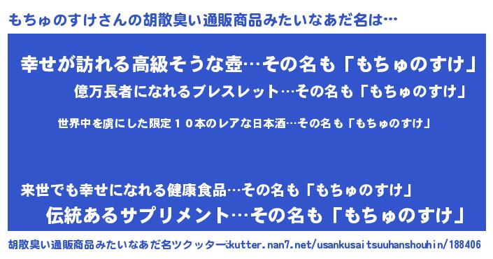 | 意味不明あだ名 | 『住所不定無職もちゅのすけ(41歳)』 |