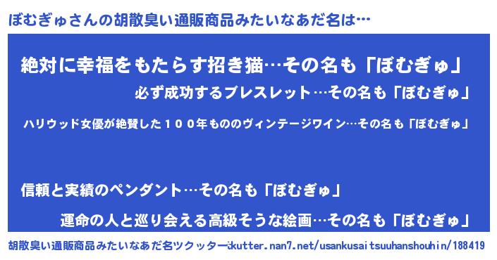 | 意味不明あだ名 | 『住所不定無職ぼむぎゅ(12歳)』 |