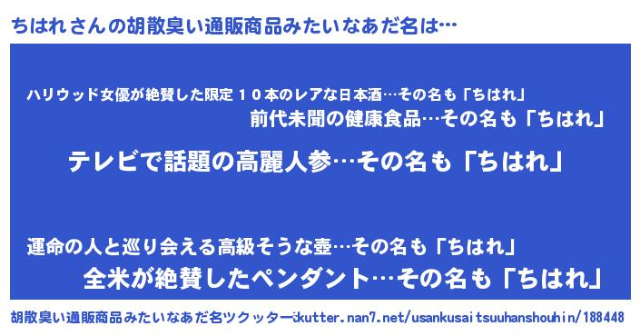 | ヒーロー風カッコイイあだ名 | 『サイバー戦士チハレ』『仮面チハダー』 |