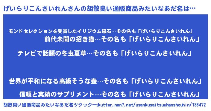 | 意味不明あだ名 | 『自称げいらりこんさいれん』 |