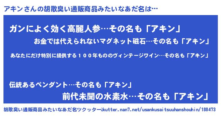 | 男性向けラノベタイトル風あだ名 | 『この素晴らしい世界にアキンを!』 |
