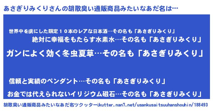 | 恥ずかしいあだ名 | 『アサギリミクリデラックス』『あさちん』 |