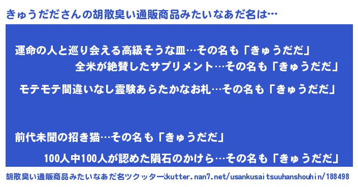 | 男性向けラノベタイトル風あだ名 | 『きゅうだだの憂鬱』 |
