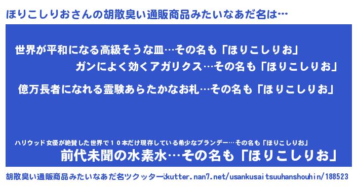 | 男性向けラノベタイトル風あだ名 | 『ほりこしりお~年齢イコール彼女いない歴の魔法使い~』 |