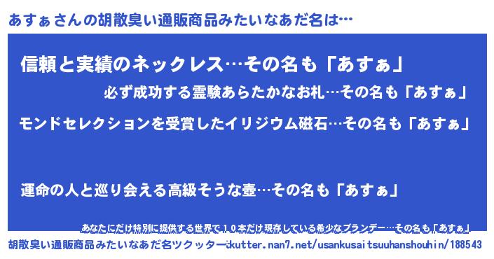 あすぁさんの胡散臭い通販商品みたいなあだ名をツクッター!
