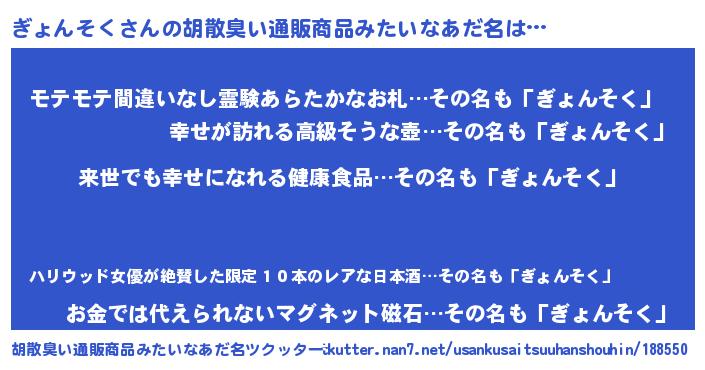 | 男性向けラノベタイトル風あだ名 | 『ぎょんそくという概念が存在しない退屈な世界 』 |
