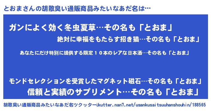 | 意味不明あだ名 | 『住所不定無職とおま(62歳)』『自称とおま』 |