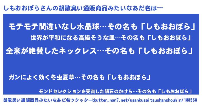 | 男性向けラノベタイトル風あだ名 | 『うちのしもおおぼらが世界を掌握している!』 |