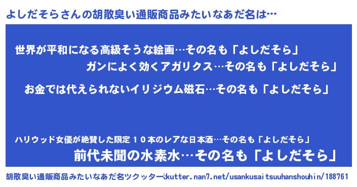 | ヘコむあだ名 | 『なまこ酢』『よしだそら(笑)』 |