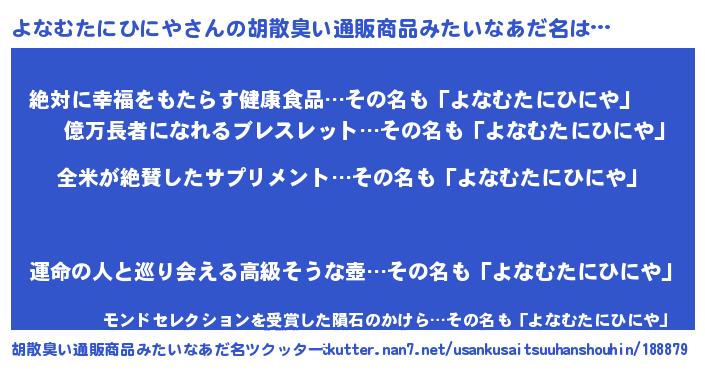 | 男性向けラノベタイトル風あだ名 | 『よなむたにひにやに滅ぼされるだけの簡単なお仕事です』 |